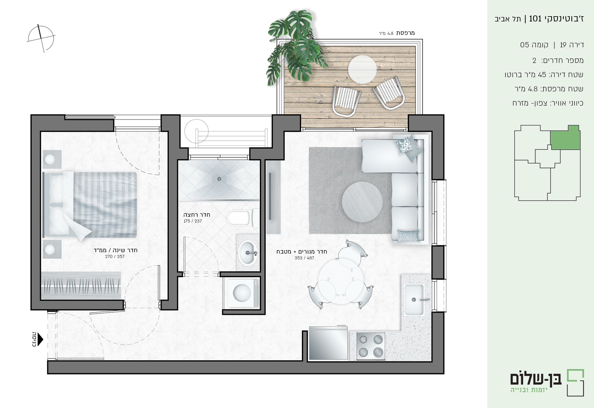 | 5 | דירה | 2 | 45 מ"ר | 4.8 מ"ר | לצפייה |