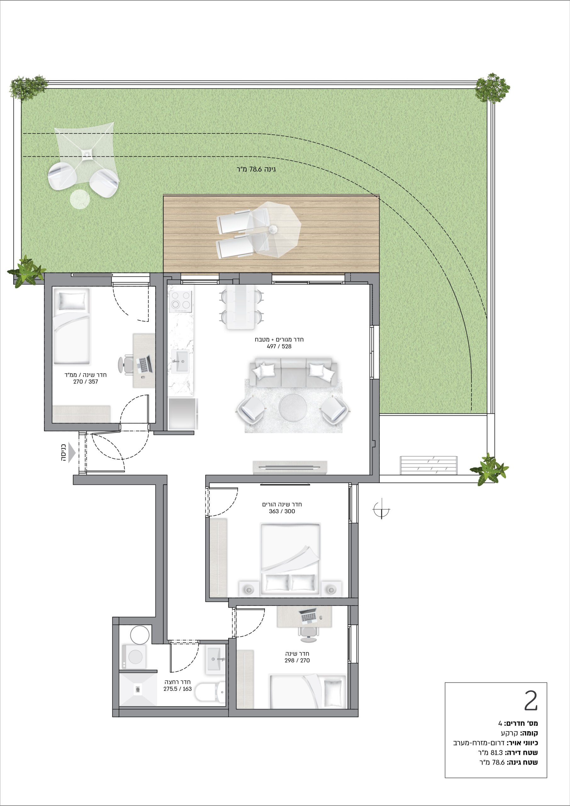| קרקע | גן | 4 | 81.3 מ"ר | 78.6 מ"ר | לצפייה |