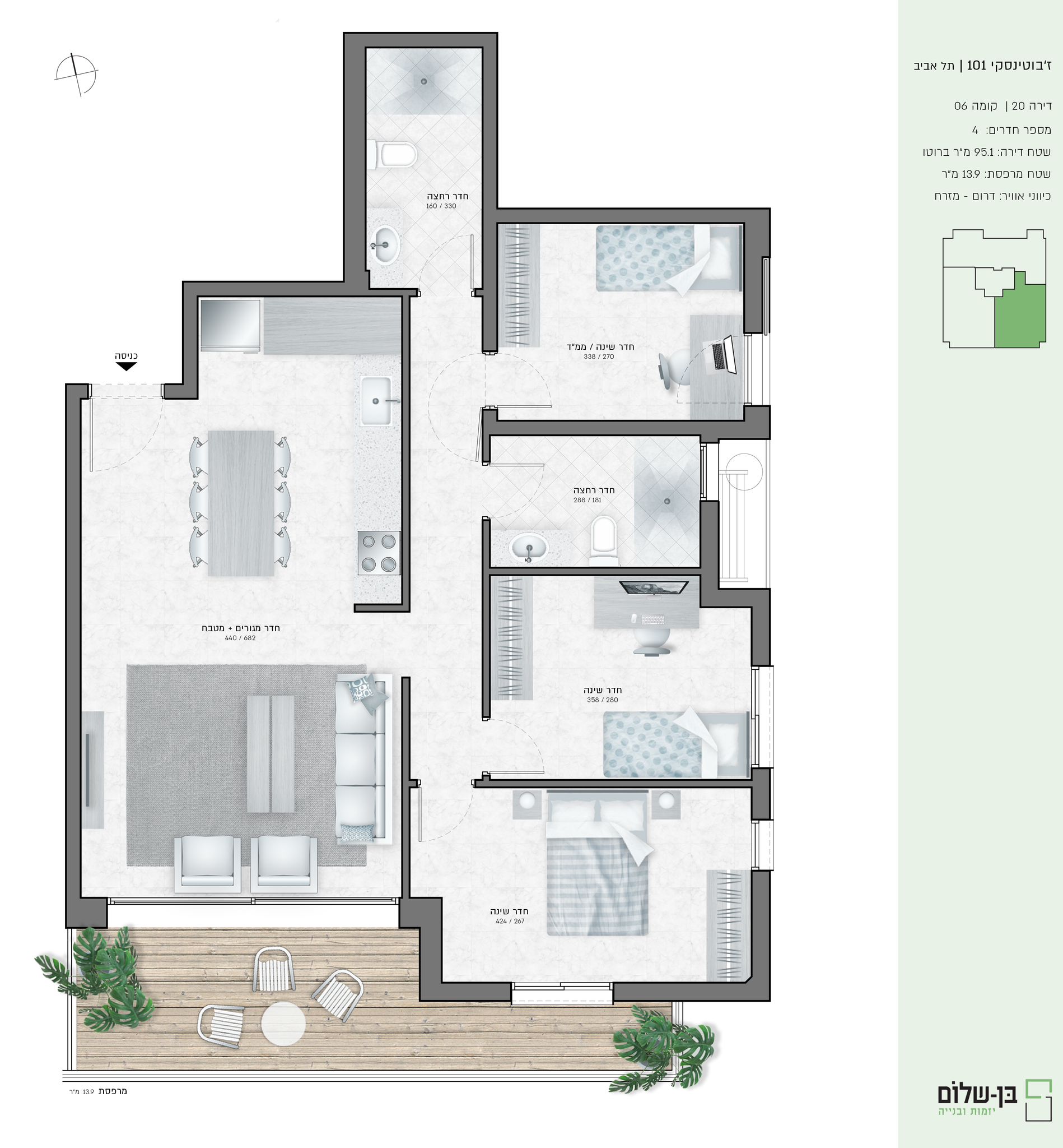 | 6 | דירה | 4 | 95.1 מ"ר | 13.9 מ"ר | לצפייה |