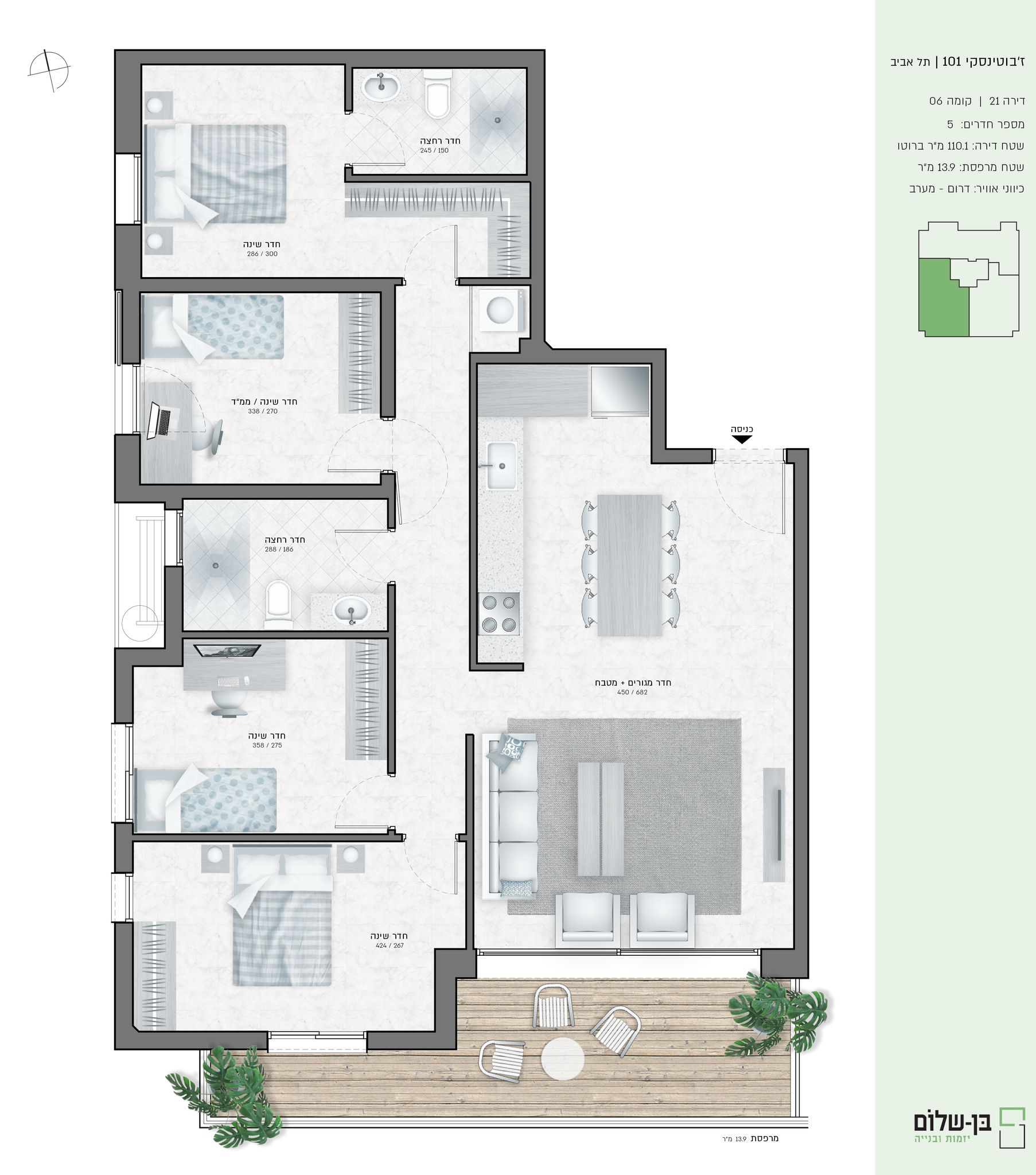 | 6 | דירה | 5 | 110.1 מ"ר | 13.9 מ"ר | לצפייה |