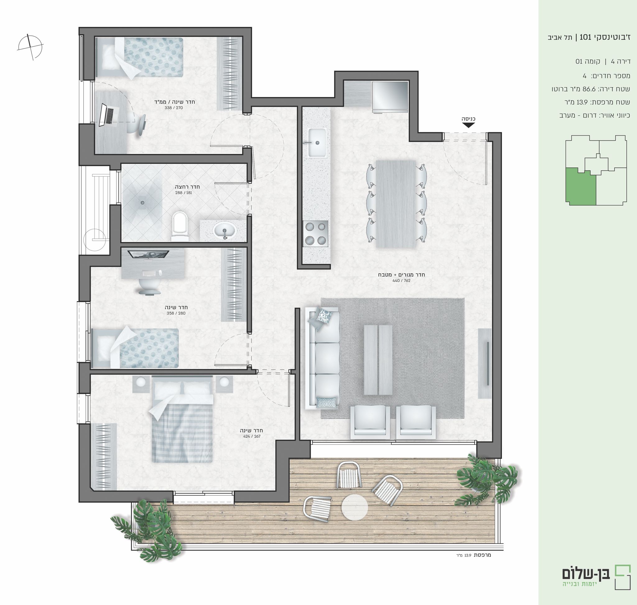 | 1 | דירה | 4 | 86.6 מ"ר | 13.9 מ"ר | לצפייה |