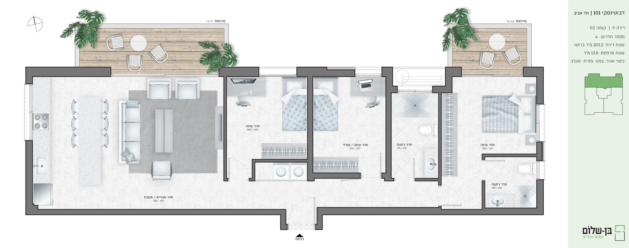 | 2 | דירה | 4 | 103.2 מ"ר | 13.8 מ"ר | לצפייה |